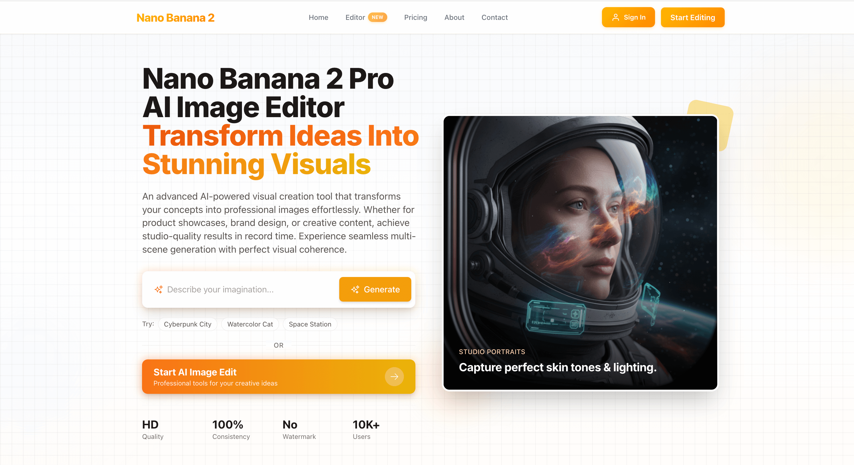 NanoBanana 2 Pro, powered by Google Gemini, is an advanced AI image editor and generator designed for professional-grade results. Key features include: • Precision Touch Edit: Edit with surgical precision by simply marking specific areas for targeted AI modifications, allowing you to change only what you want while preserving the rest of the scene intact • Conversational Image Editing: Edit images through natural chat-based interactions—simply describe what you want, and let AI do the work • High-Quality & No Watermark: Create professional, high-resolution images (1024x1024) without any watermarks using cutting-edge AI technology • Superior Consistency: Maintain perfect element consistency across different scenes, poses, and styles (people, objects, backgrounds) • Enhanced Interactive Experience: Intuitive interface with real-time preview, drag-and-drop support, and seamless workflow • High-Resolution Watermark-Free: Generate professional, commercial-ready images without watermarks