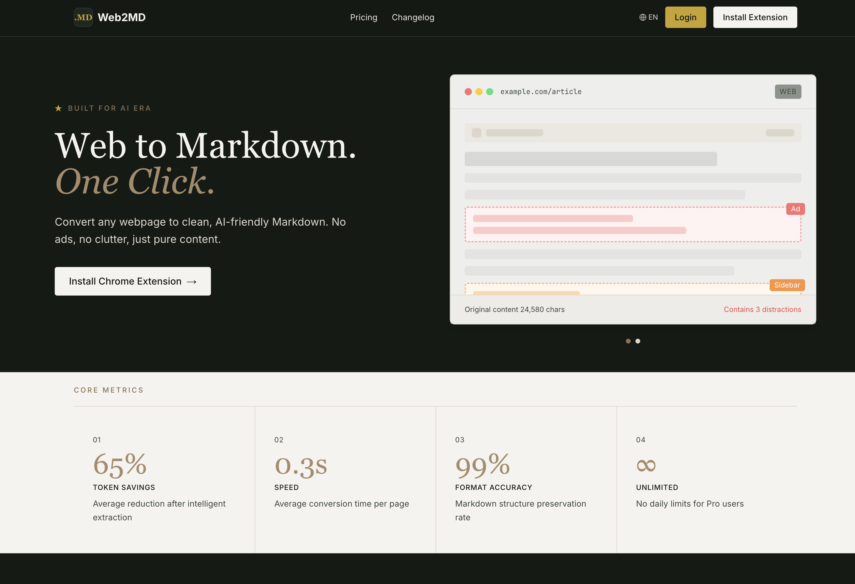 Web2MD is a Chrome browser extension that converts any webpage to clean, AI-friendly Markdown with just one click. It intelligently extracts content by removing ads, navigation elements, and clutter, delivering only the content you need. Key features include smart AI-powered content extraction, perfect Markdown formatting, image link preservation with alt text, real-time token counting for GPT-4 and Claude, smart splitting for long content, and instant one-click conversion. Web2MD achieves an average 65% token savings, converts pages in about 0.3 seconds, and maintains 99% format accuracy. It offers a free tier with 20 daily conversions and a Pro plan at $9/month for unlimited conversions, token counting, smart splitting, and API access. Perfect for AI research, content creation, developer workflows, and academic research.