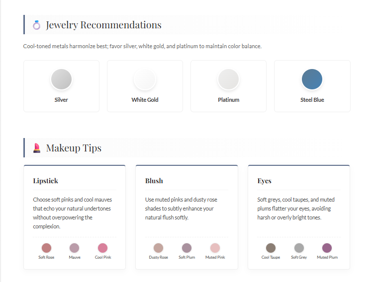 AI Color Analysis leverages advanced artificial intelligence to create a personalized color palette tailored to your unique features, including skin tone, hair color, and facial contrast. After uploading a clear photo, you'll receive an accurate, comprehensive analysis that highlights the most flattering shades for makeup, hair, outfits, and jewelry. The tool also includes a Virtual Try-On feature, allowing you to preview makeup, hair colors, and outfits directly on your photo for a realistic look at how different styles will complement your natural beauty. Whether you're enhancing your daily wardrobe or experimenting with new accessories, AI Color Analysis makes styling decisions effortless and fun.
