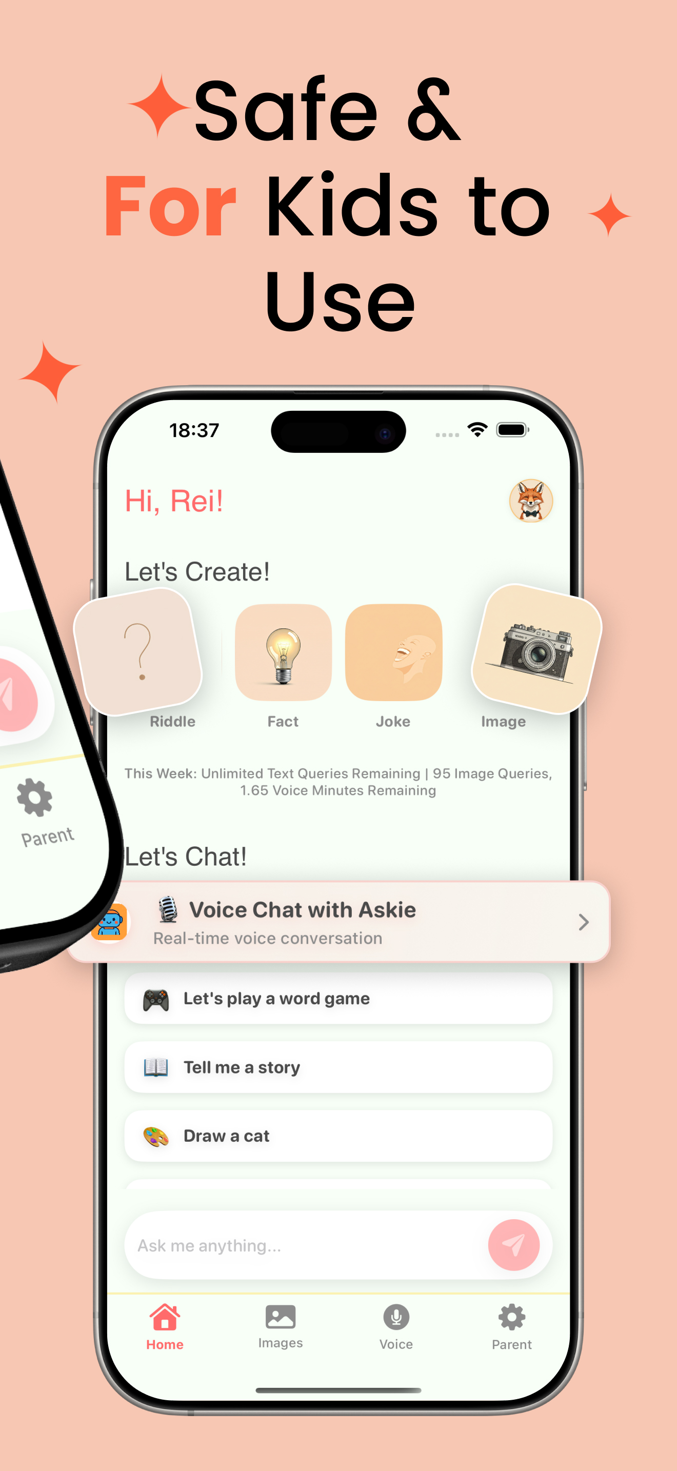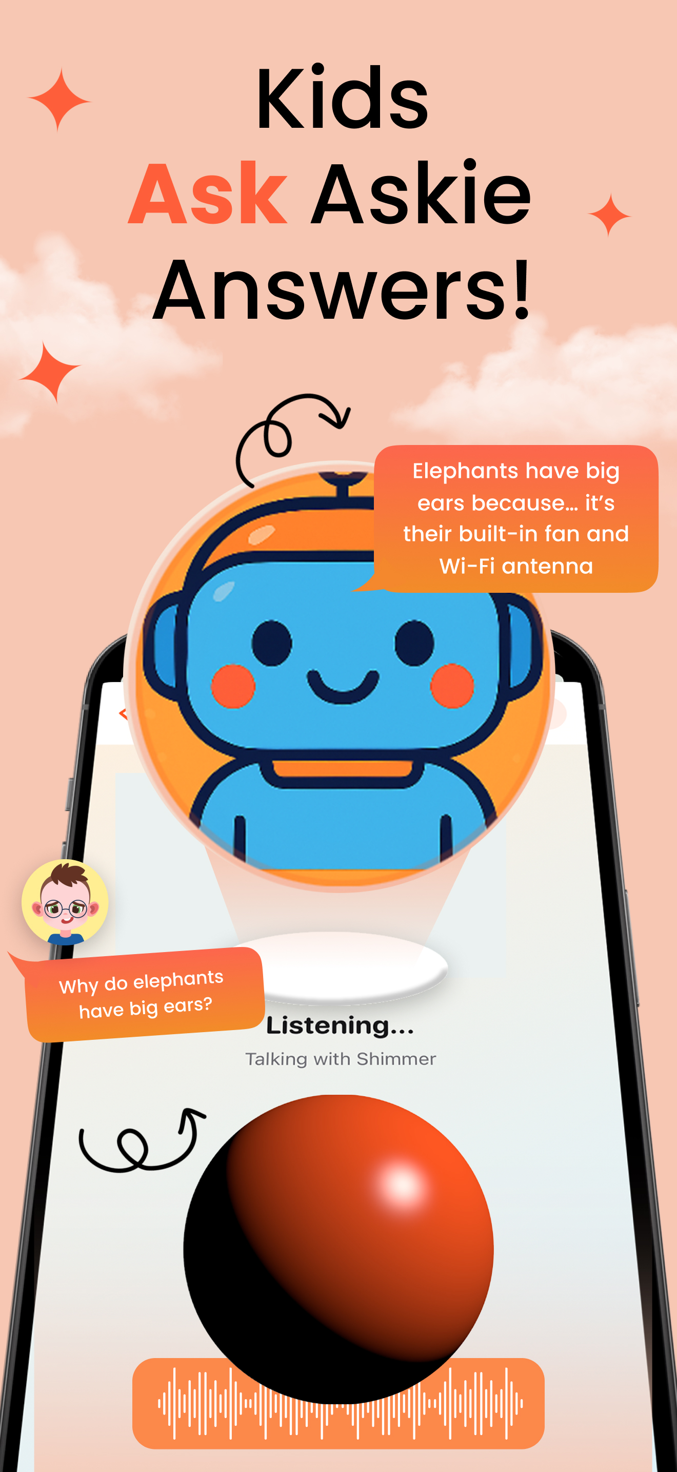The #1 AI for kids ages 4-15! Askie is the safest, most fun way for children to explore AI voice chat and creative art generation. This educational AI app answers endless questions, creates amazing artwork, and turns every conversation into a learning adventure. **Powered by the most advanced AI technology:** - GPT-5 for natural voice conversations and intelligent responses - Nano Banana AI for stunning image generation Join thousands of families using AI for kids the right way - where curiosity meets creativity in a 100% safe environment. **What makes Askie the best AI for kids?** VOICE AI CHAT - Real conversations with GPT-5, no typing needed. Perfect for car rides, bedtime, and hands-free learning AI ART GENERATOR - Kids describe anything and Nano Banana AI brings their imagination to life with instant image creation EDUCATIONAL AI - Builds vocabulary, critical thinking, and communication skills through natural conversation