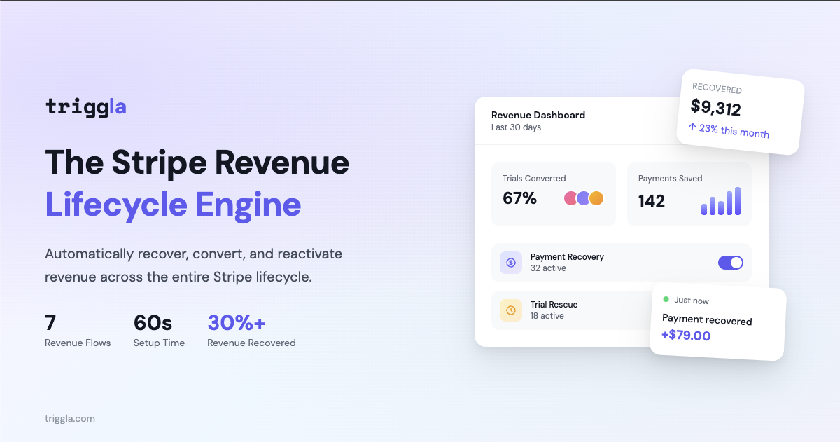 Triggla is a revenue recovery engine for Stripe businesses. It automatically recovers failed payments, converts expiring trials, wins back churned customers, and drives repeat purchases. Most Stripe businesses lose 30-40% of recoverable revenue. Trials expire silently. Payments fail with no follow-up. Churned customers disappear forever. Triggla fixes this with 7 pre-built flows: Trial Rescue, Payment Recovery, Repeat Purchase, Customer Reactivation, Churn Recovery, Onboarding, and Refund Follow-Up. Each flow activates at the right moment and runs until there's a result. Setup takes 60 seconds. Connect Stripe in one click, turn on the flows you need, done. No code, no workflow building, no maintenance. Runs 24/7 in the background. Starts at $12/month. All plans include every flow, unlimited emails. Built for SaaS founders, course creators, ecommerce brands, and subscription businesses. If you use Stripe, you're losing money. Triggla gets it back.