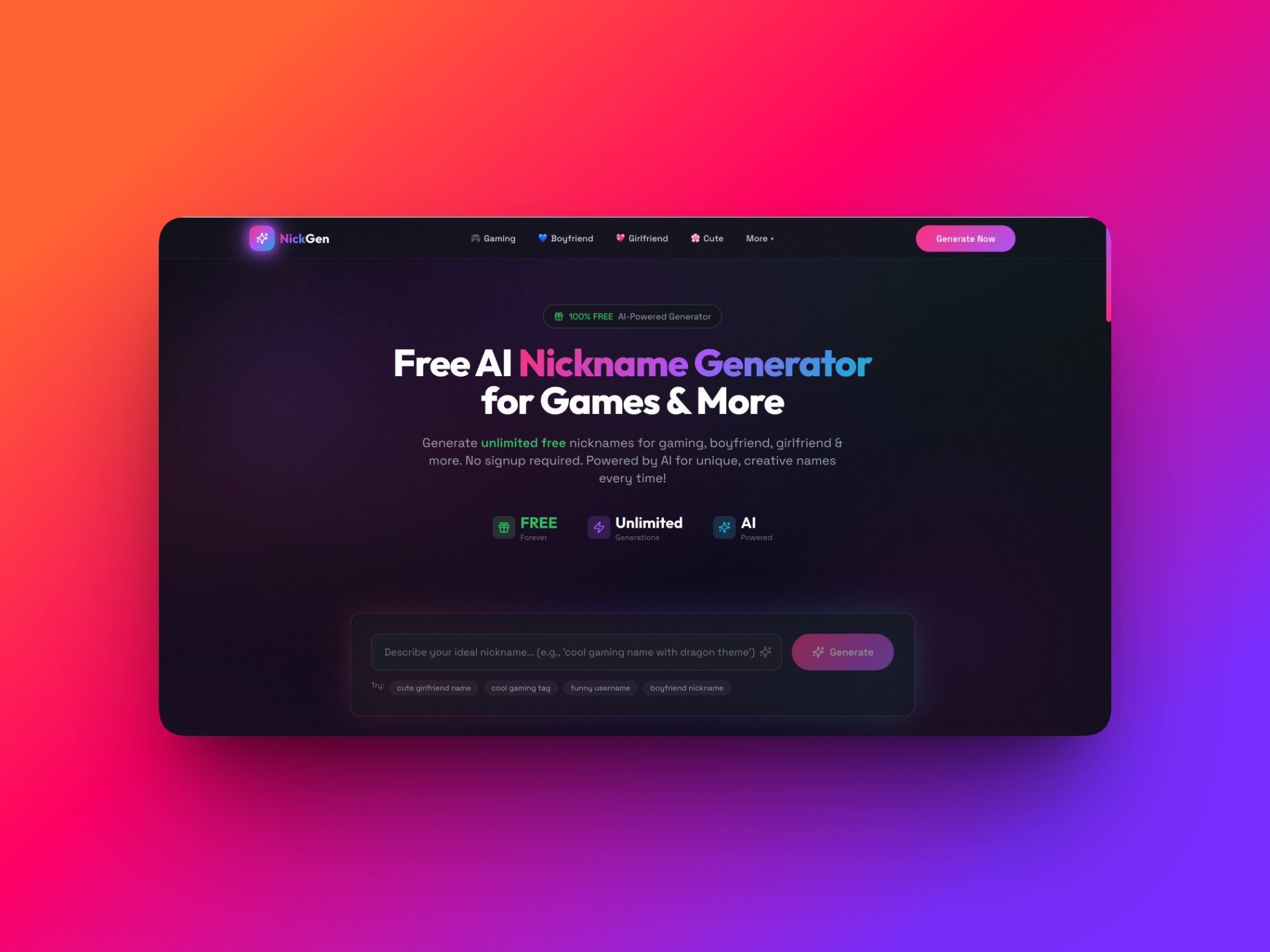 Use AI to generate unlimited free nicknames for gaming, couples, and more — no signup required. Get unique, creative names every time.