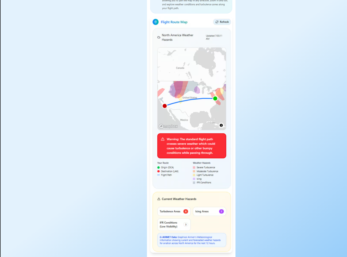 An advanced turbulence forecasting app that allows for searching for an existing flight up to 30 hours in advance to determine how bumpy your flight will be using a mix of weather and proprietary airport data, or get bumpiness forecast ratings weeks in advance using only our proprietary data to help you find the least bumpy flights before you book and even get suggestions for less bumpy alternative routes. Unlike other turbulence forecasting sites, we use proprietary data rating the typical bumpiness of takeoffs and landings at over 200 of the busiest airports in the United States, Canada, and Mexico taking into account the unique geography, traffic, and restricted flight paths of each airport that can lead to bumpy flights to and from them.