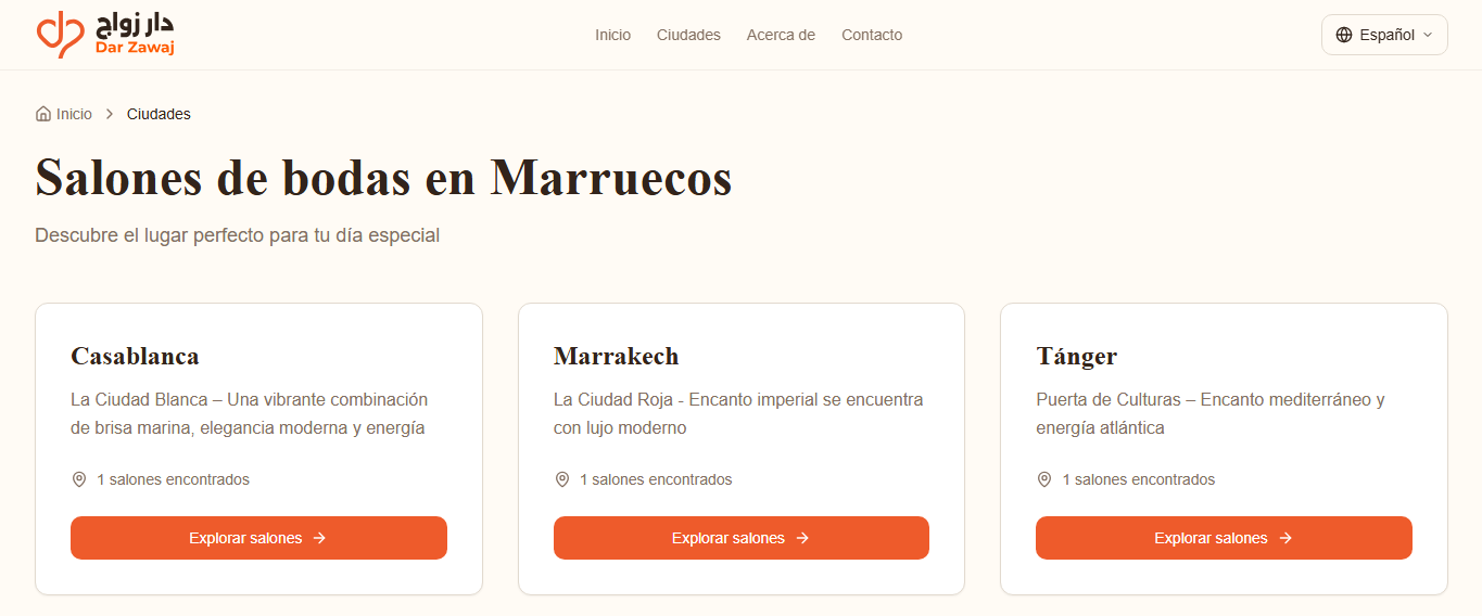 DarZawaj is a wedding venue discovery platform focused on Moroccan locations. It offers a curated collection of enchanting wedding venues in cities like Casablanca, Marrakech, Tangier, and more, displaying details such as photos, pricing, capacity, styles, and direct contact information. The platform is completely free for couples and aims to connect them with venue partners to plan their ideal wedding celebration