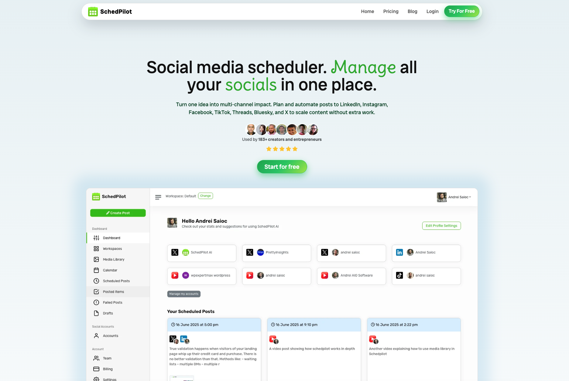 SchedPilot is your all in one social media command center for creators, agencies and busy founders. Plan a week of content in one sitting, let smart queues handle the posting, and stop worrying about “Did I publish today?”. Connect Instagram, TikTok, Facebook, LinkedIn, X (Twitter) and Pinterest, then reuse or repurpose winning posts with just a few clicks. Stuck for ideas? SchedPilot’s AI ideation helps you turn rough thoughts into ready to publish posts, hooks and captions that actually sound human. See what works at a glance with simple analytics instead of drowning in spreadsheets, and keep clients happy with clear calendars and proof of work. Whether you manage one brand or twenty, SchedPilot keeps content, scheduling and ideas in one clean, fast dashboard so you can hit publish consistently without burning out.