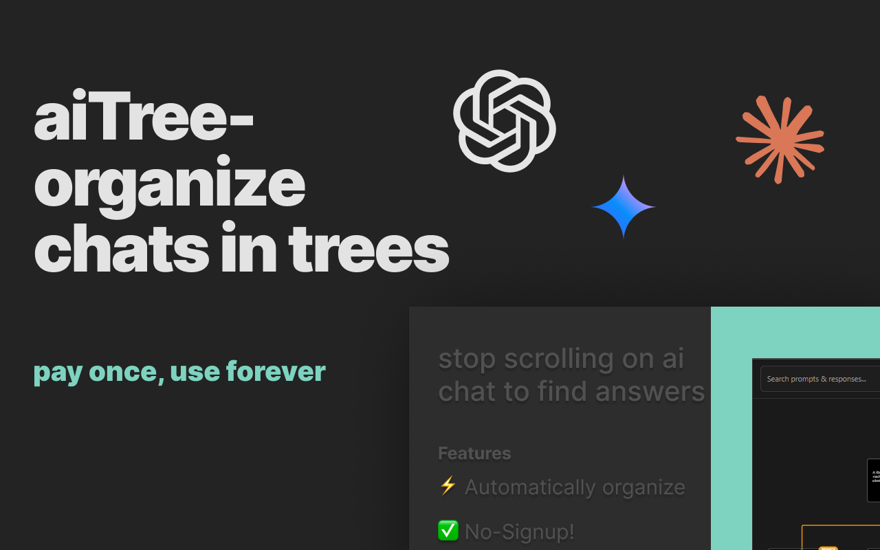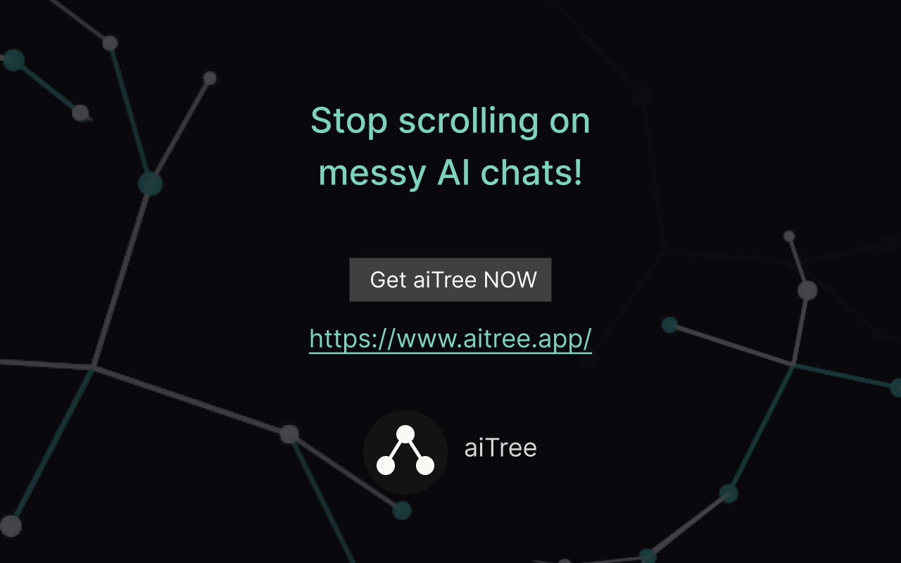 aiTree - Visualize & Organize Your AI Chat Conversations Stop scrolling through messy AI chats. Transform your ChatGPT, Claude, and Gemini conversations into visual tree structures with semantic branching and global search. Organize your AI workflow effortlessly.