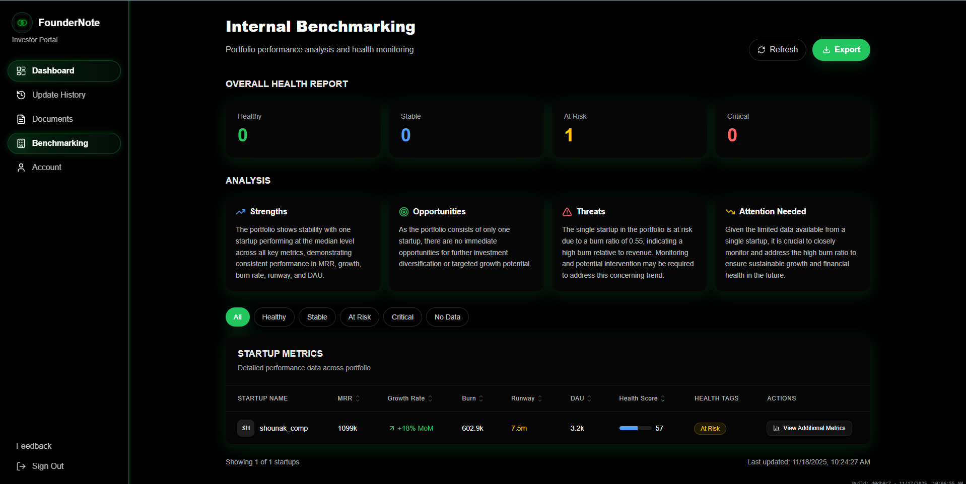 FounderNote is a startup reporting and investor update platform that helps founders share structured updates effortlessly while giving investors real-time portfolio intelligence. Instead of scattered emails, Word docs, spreadsheets, or WhatsApp notes, FounderNote standardizes metrics, KPIs, and progress reports into a clean, comparable format. Investors get a unified dashboard with insights, benchmarks, and early risk detection. By improving founder–investor communication, FounderNote increases transparency, alignment, and portfolio performance.