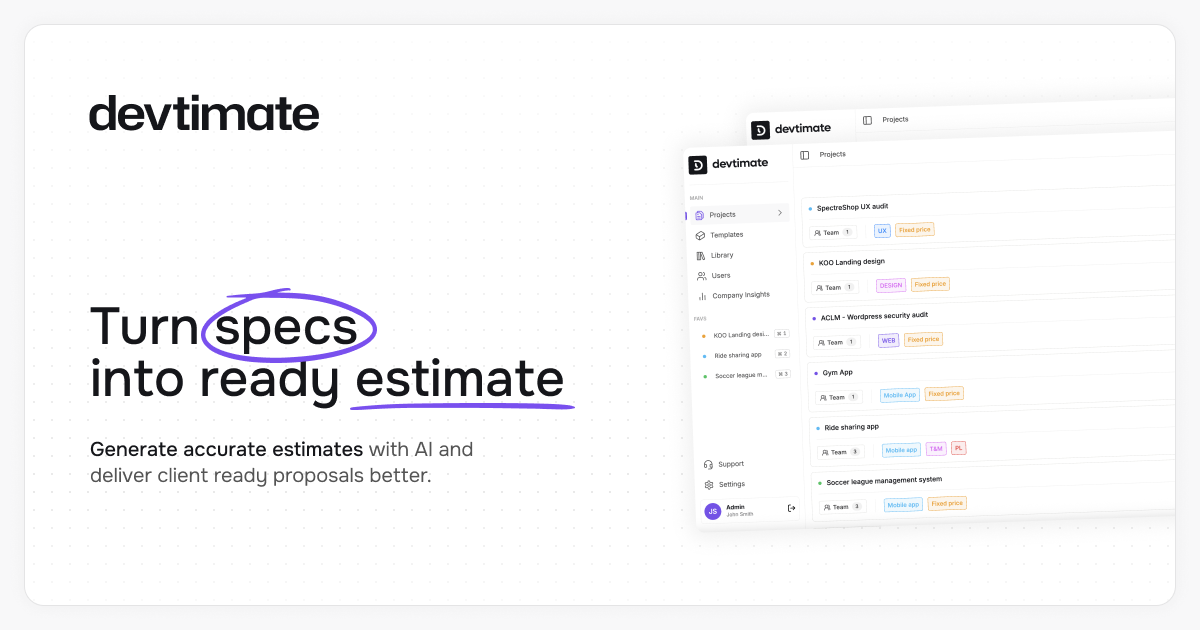 Generate accurate software project estimation with AI. This tool allows you to create precise estimates for software projects using artificial intelligence. With features like drag-and-drop modules, min–max hours, and the ability to export to Jira or Asana, it streamlines the estimation process. Enjoy a 14-day free trial to explore its capabilities. Core Features AI-Powered Estimates: Generate ballparks or complete estimates from specs with AI. Project Structure: Structure your project with modules and tasks. Templates & Libraries: Speed up your estimating process with reusable templates. Proposals: Generate a proposal from the estimate in minutes. Integrations: Connect your favorite tools to enhance your estimation process. Better Estimating Consult with experts to improve your estimation process. Watch YouTube videos and access the Academy library for comprehensive materials to maximize the use of this product.