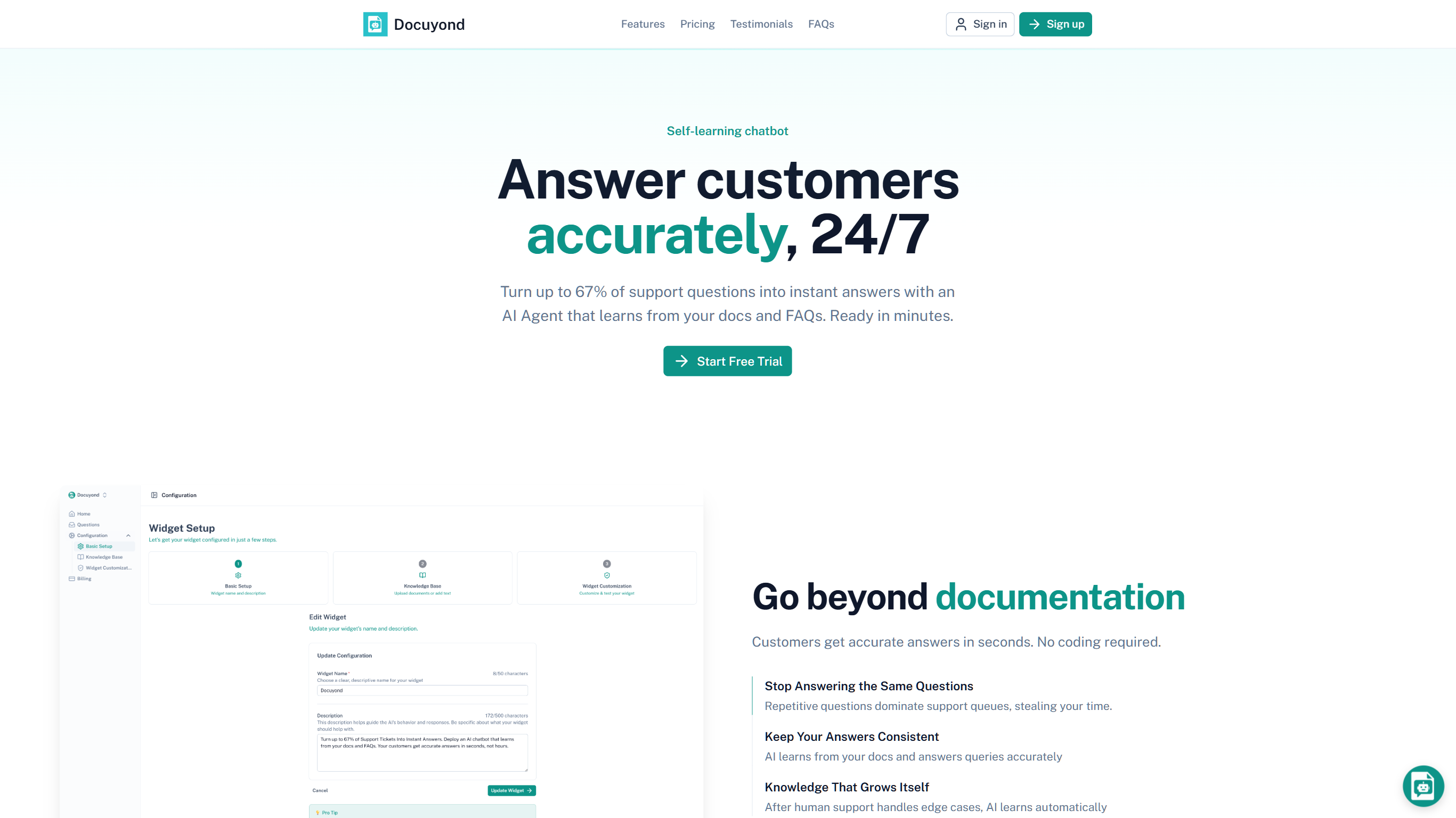 Answer customers accurately, 24/7 Turn up to 67% of support questions into instant answers with an AI Agent that learns from your docs and FAQs. Ready in minutes. Go beyond documentation Customers get accurate answers in seconds. No coding required. Stop Answering the Same Questions Repetitive questions dominate support queues, stealing your time. Keep Your Answers Consistent AI learns from your docs and answers queries accurately Knowledge That Grows Itself After human support handles edge cases, AI learns automatically Your custom AI widget Trained on Your Data Upload PDFs, docs, and FAQs. Our AI learns your business instantly and answers like your best support agent. One-Line Setup Copy, paste, done. Works with WordPress, Shopify, React, Vue, or any website. No complex integrations. Smart Handoff AI handles routine questions, seamlessly escalates complex issues. Your team focuses on high-value conversations. Perfectly Branded Customize every detai